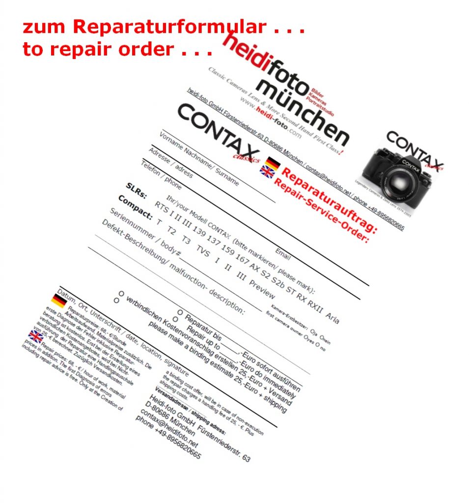 Ich selbst nehme keine CONTAX Reparaturen oder Ersatzteil- Lieferungen vor. In Sachen Reparaturen & Revision läuft alles auschließlich über heidi-foto in München. Hier können Sie das CONTAX Reparatur-Formular ausrucken… und zusammen mit ihrer Kamera an heidi-foto nach München übersenden.